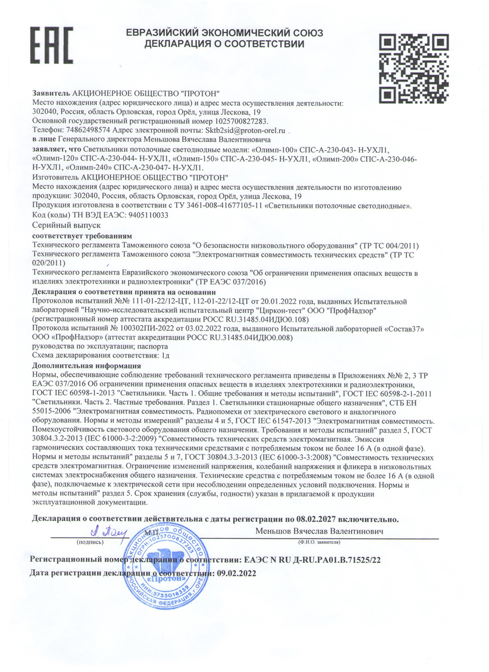 Добавлен сертификат на светодиодные светильники серии «Олимп»